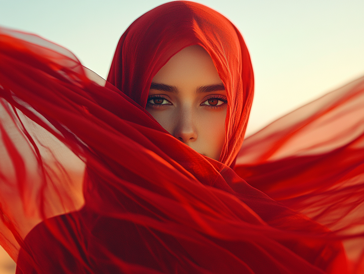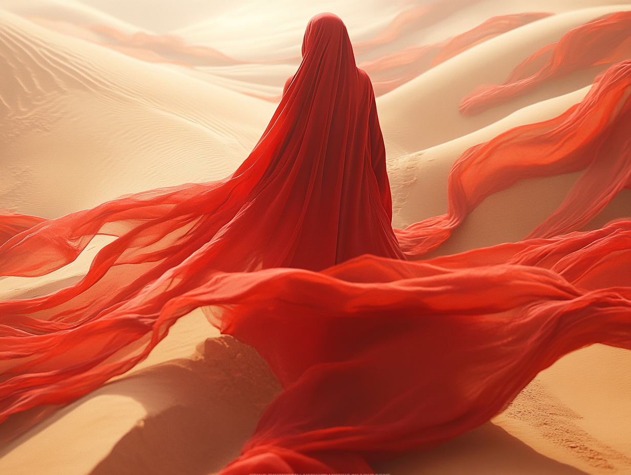 A journey that transcends time and tradition, where the flowing grace of the red abaya meets the vast, endless expanse of the desert. The rich, vibrant red of the fabric dances in harmony with the shifting sands, creating a stunning contrast that speaks to both elegance and strength. Bold and timeless, this fusion of heritage and modern fashion represents a seamless blend of cultural pride and contemporary luxury. Each movement of the abaya tells a story of centuries-old traditions, while its luxurious design embodies an unapologetic celebration of femininity, grace, and sophistication. It is a visual representation of the enduring connection between the past and the present, where fashion becomes not just a style, but a statement of identity and heritage.